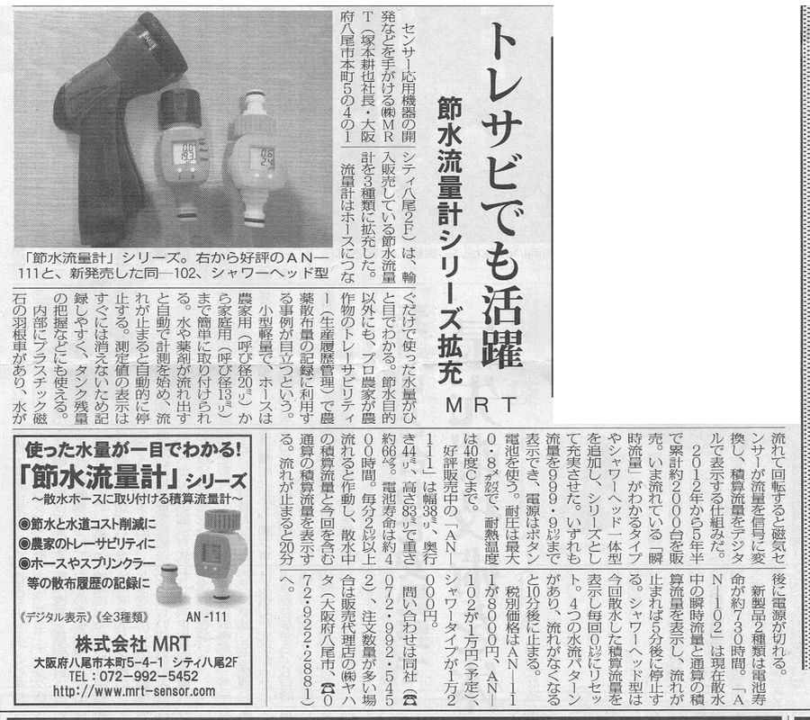 6月29日付けの農経しんぽうで、節水流量計が紹介されましたby webmasterに 新着情報on 投稿日: 2017年6月26日 圃場に撒いた水量の積算記録、野菜に希釈薬液を撒いたトレーサビリティ記録など、農業分野での用途を紹介していただきました。 詳細はコチラ