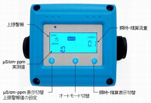 これ1台で、濃縮した塩素濃度の上昇を導電率で、炭酸カルシウムの水硬度の上昇はTDSで、膜の交換時期は積算流量で、それぞれ測定しブザー警報でお知らせします。