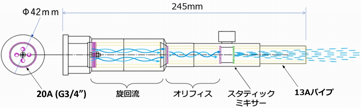ワンパスで、約 3 億個/mL (平均径0.00015mm )のファインバブルが発生。